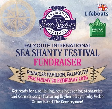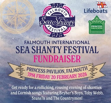 This Friday, at Princess Pavilion, four brilliant groups will take you through an evening of traditional shanties and Cornish songs – and we're nearly sold out! Here's how your night will unfold: 6:30 pm – Doors open 7:05 pm – Toby Webb kicks off 7:55 pm – Bryher's Boys take the stage Interval – Raffle draw with fantastic prizes! 9:10 pm – Next up, Stuns'ls 10 pm – Final performance of the night from The Countrymen 10:50 pm – All groups on stage together for "Cornwall My Home" 11 pm – Home time. Get ready for a night of rousing harmonies, foot-stomping choruses, and an atmosphere that'll have the whole room singing along.